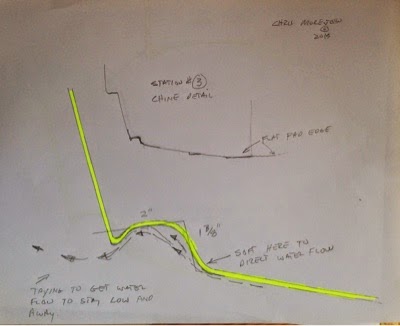 If polling in a 12" chop in a long lean lightweight skiff with 2 sports aboard plus you in wind, you will most likely be poling into it or crabbing your way across a flat. If your upper Chines are high enough you will not make any noise. But in a long low light weight skiff to get any use out of an upper chine or sheer spray rail it cannot be too high. In my design I have drawn in a rounded stern to make the boat as quiet as possible when poling, drifting or rowing down wind. It will be interesting if this rounded stern detail will catch on in other designs.