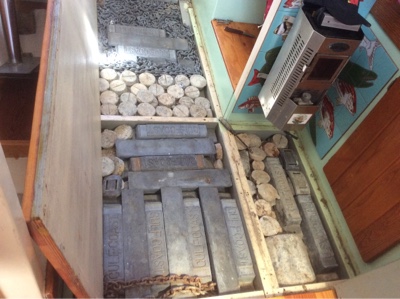 Lead ! Lots of lead. The round pieces I salvaged years ago from a wreck. 1,800 lbs worth. I have just sold them for $.90 a lb. The normal lead for Hogfish is 6,000 lbs. now more room for rocks and sea glass ! All lead is stored under these floorboards that are screwed down securely. Each section has no more than 1,500 lbs in each section. I forgot about having that 150' of 3/8" chain under there !